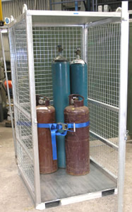 Secure gas cylinder storage cage, suitable for building sites and mines. Fitted with 4 point crane lift and fork pockets under.