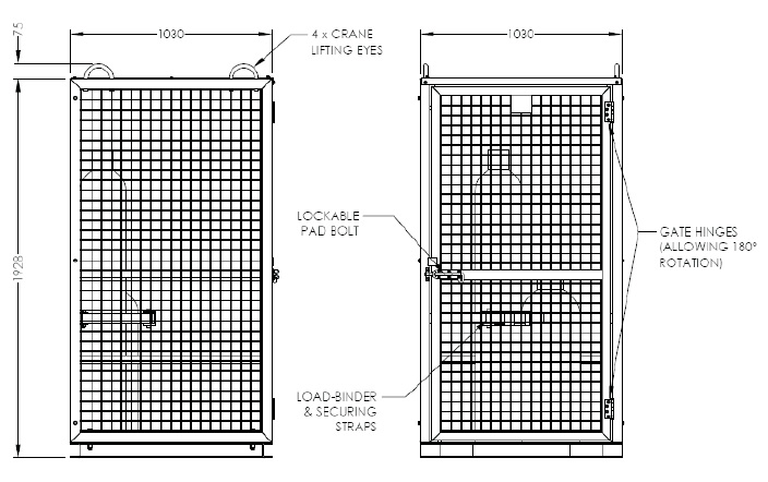 The lockable door, sheetmetal roof and mesh sides ensure cylinder and gear security. A load binder prevents cylinder movement during travel